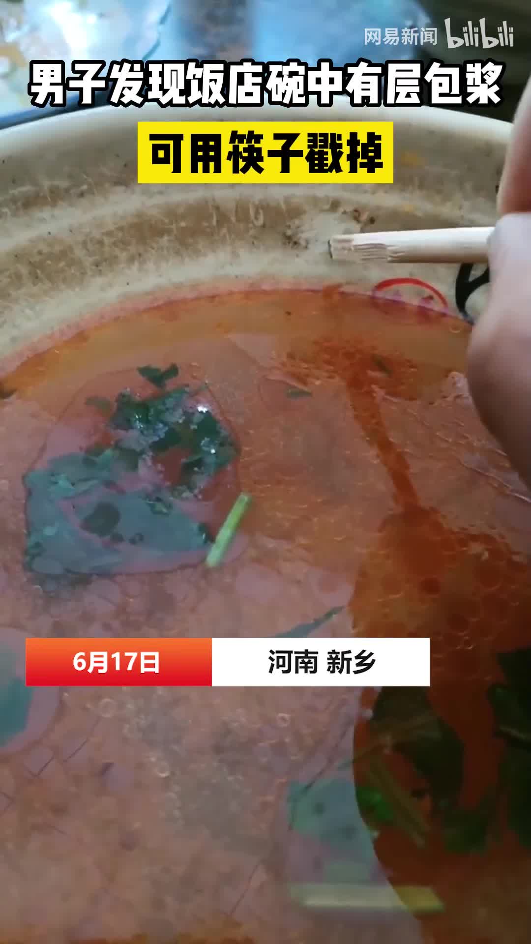6月17日,河南新乡。一男子在餐厅吃饭时,发现碗边有一层深色残留的污垢,用筷子用力戳竟可以戳下。男子称也没拉肚子,小饭店也不容易,结完账便直接离开了。