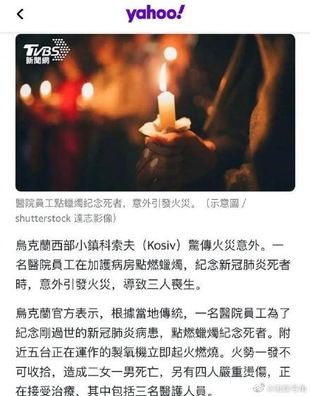 轮脑残,还得是这个国家,乌克兰某医院,医护人员在ICU病房里点燃蜡烛,要悼念刚刚去世的一名新冠肺炎患者,不料引燃了ICU病房里的五台氧气机......这场火灾又烧死了同病房的三个病人