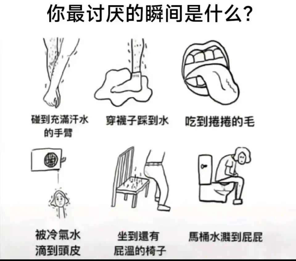 2022-07-29 投票进行中 36人 1. 碰到别人沾满汗水的手臂 56% 2. 穿着袜子踩到水 6% 3. 吃到卷卷的毛 17% 4. 被空调冷气水滴到头 6% 5. 蹲马桶被水打湿屁股 8% 6. 做到还有温度的椅子 8%