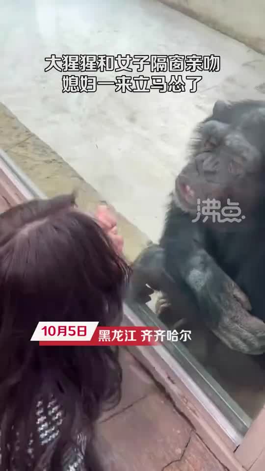 10月5日,黑龙江齐齐哈尔。动植物园一公猩猩和女子隔着玻璃亲吻,媳妇一来立马怂了,还擦掉玻璃上的唇印。当事游客关女士表示,工作人员称这是一对夫妻猩猩,这只雄性猩猩喜欢美女,于是就逗它。结果它媳妇看到了,它们晚上回去肯定得干仗。