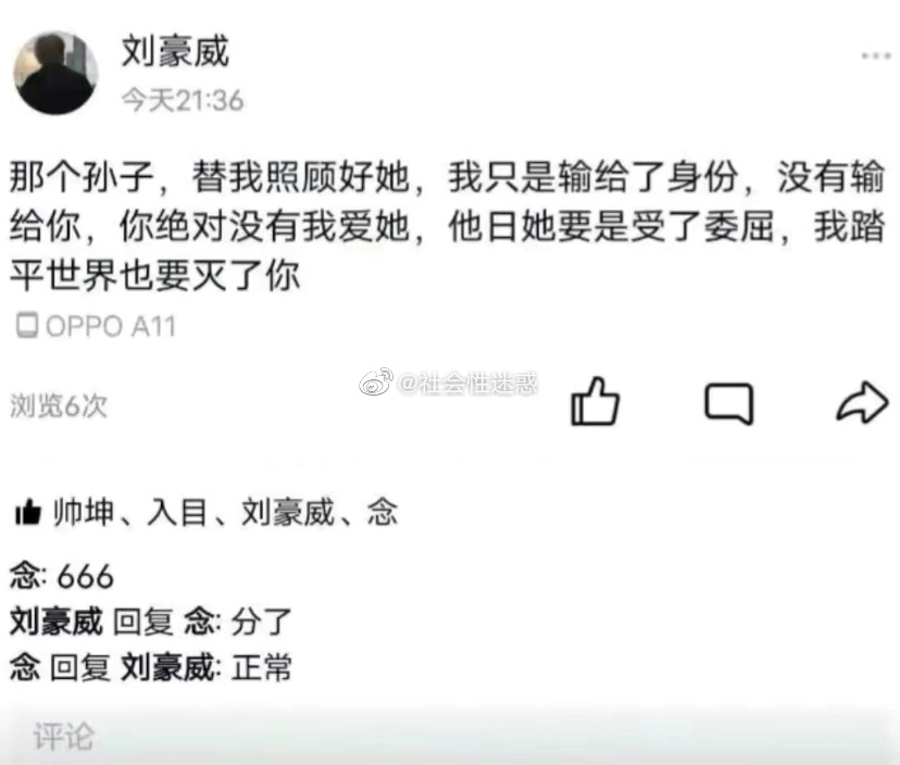 低情商:我们队没来; 高情商:我们队在备战第23届世界杯! 小伙子还是太年轻了,面对这种情况还是做不到从善如流。 凡事得往深处想,想想在其他国家或为短暂的胜利而疯狂的庆祝,或为一时的失利而沮丧的时候,我们的男足,已经在积极的备战下届世界杯了,世界海参杯! 这是多么有理想有抱负的一群人呀! 既然男足这么积极了,我想,留给中国男足的借口,估计已经不多了。 下个世界杯,就争取让国足近施工队参与一下世界杯建设吧! 不过,这位小伙子即便是体验了一段又心酸又尴尬的经历,但帅气也不减分毫。 仔细想来,我说这小伙字那么第一眼为什么眼熟,原来是有点像郑伊健啊。 都说世界上没有一片相同的树叶,但是却没有人告诉我,原版和高仿的区别。 近日,世界杯德国VS日本的小组赛中,主裁伊万巴顿被网友发现酷似宋小宝,网友们纷纷表示:“宋小宝老师怎么还背着我们打两份工呢?” 伊万·巴顿是萨尔瓦多职业足球裁判员,2022年5月19日,FIFA(国际足联)官方公布了卡塔尔世界杯的执法裁判名单,伊万·巴顿作为主裁入选,这也是他首次在世界杯中担任主哨。 先别说像不像的,就问裁判骗钱这事儿管不管? 裁判:你别没事找事,小心我给你买的球队吹黑哨。 我:在天台了。 也不是第一次上天台了,没没都是上去看看风景,丝毫没有真的要轻生的意思。 咱又不会轻功,真跳下去,摔死了咋办? 等我练好了水上漂,我再看足球吧! 近日,浙江杭州。 有网友拍下,一大爷在钱塘江面自如行走,远远望去宛若在水上漂。 拍摄者称,江中间有一块很大的滩涂,大爷可能是本地人,完全凭着记忆和经验走,其实是走在滩涂上,但是感觉还挺危险的。 大爷:我今年九十三,筑基大成就结了金丹,非专业人士看看就好,请勿模仿!! 没想到,斗宗强者竟然恐怖如斯!! 这要是被歪国人看到了,我们解都解释不清了!!! 光是咱们的功夫熊猫,外国人看到都要抖三抖! 神秘的东方力量,总是在关键时刻,起着不可替代的关键作用。 叶师傅:很好,看来我的衣钵得以传承了。 桂师傅常说,男儿膝下有黄金。 说跪就跪,有损颜面。 近日,福建泉州一男子进店推销平安符,店主回应不要后就下跪。 店主说,他拿平安符来要钱的,1个10块,自己说不要,他就下跪了,后来自己把符还给他,怕他赖在这边不走就给了几块钱。 很显然,这已经不是颜面的问题了,这都算是敲诈了,好嘛? 这世界到底是怎么了? 如果是我,我就让他跪着,爱跪多久跪多久,我铁石心肠&心狠手辣。 要是还是不走,大不了我也给他下跪。 古语曰“待之以礼,还之以及",既然对方能耐这么大,都行这么大的礼了,那臣这一跪,就是一辈子。 正如臣退了,臣这一退,就是一辈子 : 臣一罪:遇你 臣二罪:识你 臣三罪:交你 臣四罪:悦你 臣五罪:想你 臣六罪:顾你 臣七罪:守你 臣八罪:护你 臣九罪:恋你 臣十罪:爱你 十罪俱全 是臣罪该万死!!! 什么?什么以牙还牙?咋说得那么难听。 这叫以进为退,这叫特么的平等! 这个世间总是有无赖存在,郭子曾经说过,很多人不成功的原因就是太过于尊重自己。 论不尊重自己,这个下跪的人成功了。 但是你给我下跪我为什么要给你钱呢,你以为这是在卡塔尔吗? 没想到穷人去卡塔尔,卡塔尔都要给他们整点消费得起的交通方式…… 原来是为了让穷人享受这种优渥的待遇,卡塔尔人民才要加班到下午两点!! 泪目了。 希望我下次做这种梦,不是在白天。 好啦,今天的轻松一刻到这里就结束啦,咱们下期再见!! 一些网友关于张兰的评价 好家伙,我看你这是想入菲菲吧?? 李清照: 来先给我背几首我的诗 背出来我们再聊其他的 一般都是用学弟学妹(狗头 能看出师傅在努力克制了 某网站:我们已经把合同和钱烧过去了,希望你不要不知好歹 有人知道这啥意思吗 要饭大爷都无语了 哈哈哈哈哈哈哈哈留住宾客的方式是放场球赛,婚礼结束谁也舍不得走 用四个字形容一下你的初恋 上期问: 听说认识她的人,孙子都快能打酱油了,所以她是谁?