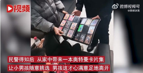 男孩来到寮步分局外的路边嚎啕大哭,民警得知后,从家中带来一本奥特曼卡片集让男孩挑选。随后,民警将小男孩安全护送到家。