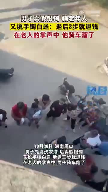10月30日,河南周口。男子先发洗衣液,然后将假手镯卖给老人,称手镯是白送的,后退三步就返回退钱。结果该男子后退三步后骑着摩托车跑了,后退时被骗老人还在为他鼓掌。