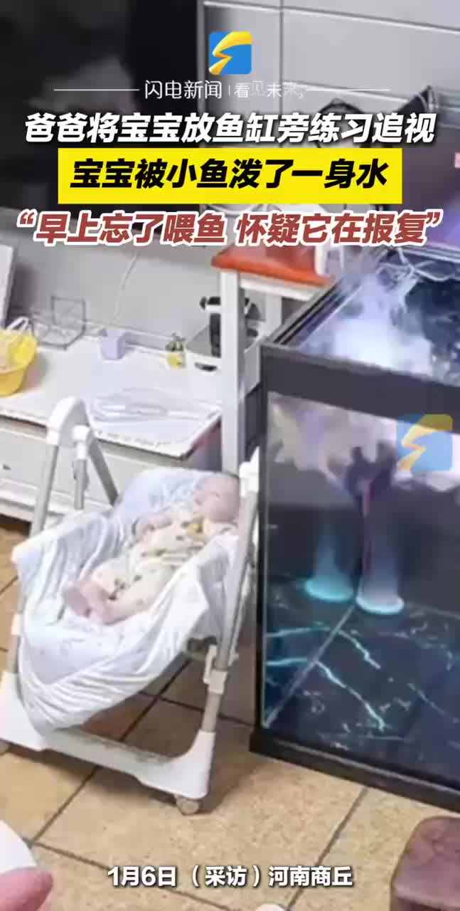 1月6日,河南商丘。爸爸将宝宝放在鱼缸旁练习追视,宝宝被鱼缸里的鱼泼了一身水。爸爸:早上忘了喂鱼怀疑它在报复。