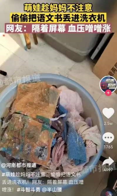 12月9日,江西南昌。李女士洗衣服,放洗衣液时还没发现异常,出去一趟回家后,打开洗衣机却发现有一本被泡烂的语文书,整个洗衣机里一团糟。李女士称,大儿子已经上六年级,比较懂事。肯定是她调皮的小儿子干的,当时小儿子不在身边,如果在身边的话肯定把衣架都要抽断。
