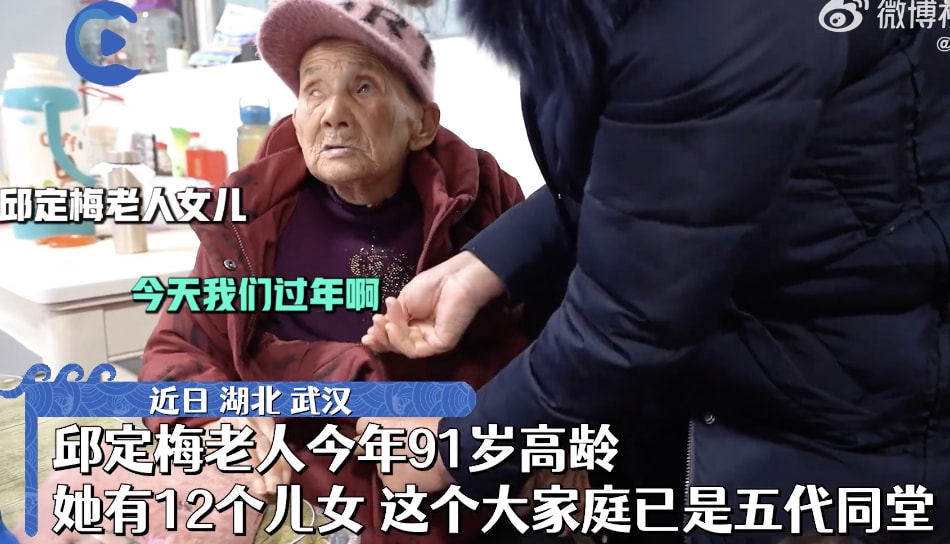 湖北武汉的邱定梅老人今年91岁高龄,她有12个儿女,这个大家庭已是五代同堂,家族成员已经达到160多人。