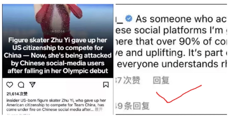 说起这个,不得说说花滑的朱易。北京时间2月7日晚,美国媒体“Insider”在社交媒体平台Instagram上,发布了一张中国花样滑冰女运动员朱易泪洒北京冬奥会赛场的照片,并配上了这样的一段文字:“在冬奥赛场摔倒后,放弃美籍而代表中国参赛的朱易正遭受着来自中国网民的攻击。”