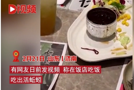 2月21日,山东济南。有网友日前发视频称,在饭店吃饭吃出活蚯蚓。