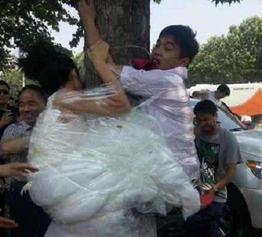 24、为了结婚后如胶似漆,新郎新娘也是拼了,一起绑在了树上。
