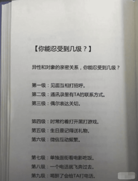甜蜜的爱情谁不想拥有呢?但是呢有时间就是那么的狗血,特别是恋爱的小伙伴,一定要记住了,对于女生来说,千万不要相信自己男朋友的什么异性朋友,如果一个男生是真的喜欢你的话,是不会经常和其他的女生频繁的来往的,对于男生来说也是这样,不要相信女友说的什么男闺蜜,什么男闺蜜都是假的,其实男生最反感的就是这个了,有些什么男闺蜜感觉比自己这个正牌男友还重要,要是你的女朋友是这样的话,还是早点分手了吧,你的对象和异性的亲密关系,来看看你能够忍受到几级?