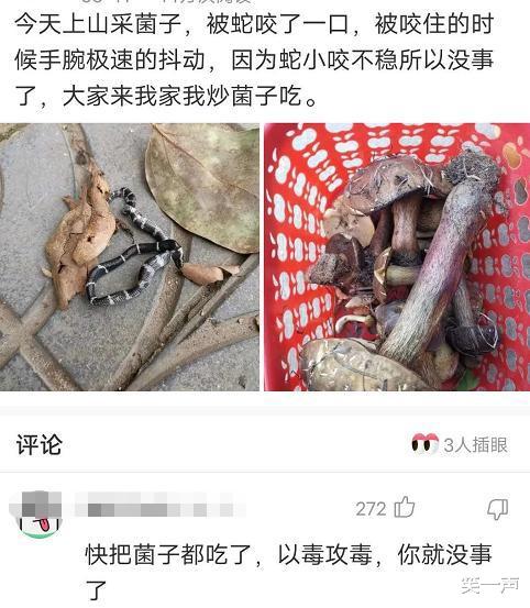“上山采菌子的时候被蛇咬了,咬住的时候手腕急速抖动所以没事”坟头草多高了?哈哈哈哈