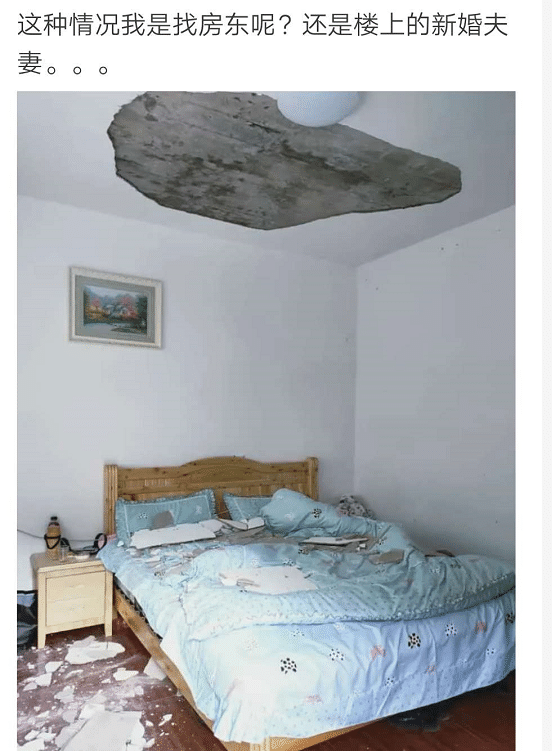 每个人对于家的定义是不一样的,而大多数人觉得家是工作一天释放压力的地方,但有时候也会遇到各种各样的奇葩事情,就有一位网友发现卧室的天花板上的墙皮落了下来,想问问大家这种情况究竟是找房东呢?还是找楼上的新婚夫妻?这个问题有点内涵哦,小编觉得肯定第一时间找房东,毕竟是他的房子呀,没想到评论区里一群戏精,出什么样的主意的都有,大家觉得哪一个最靠谱呢?