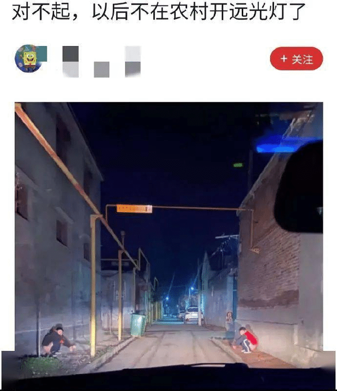 有些农村地区,路灯还没有普及到角角落落,当我们开车到这些地方的时候,肯定是要开车灯的,这本来挺正常的吧?网友这天开车经过农村,一路上开着远光灯行驶,没想到还会遇到这种事儿,农村的孩子在抹黑蹲在路边上厕所,面面相觑真尴尬,这位网友表示再也不想要开远光灯走农村夜路了...哈哈