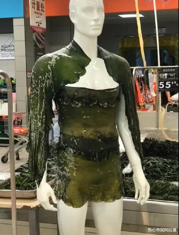 超市大妈们是服装设计毕业的吗哈哈哈,深藏不露。这海带衣服够时尚的了,还有披肩,甚至还剪出了花边?海鲜区摆个衣架子是什么鬼啊。