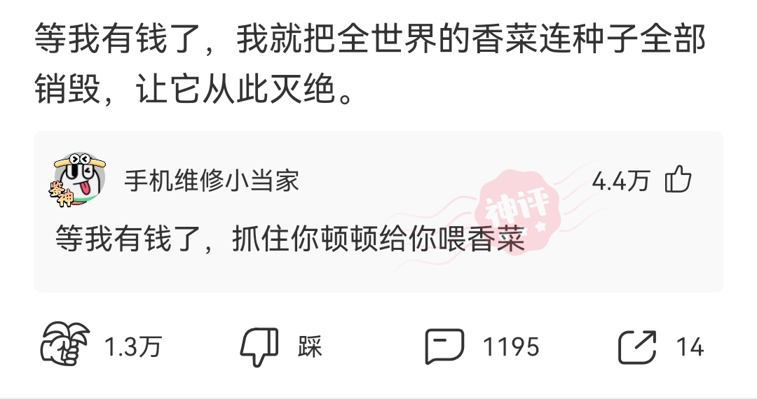 【沙雕问题7】:等我有钱了,我就把全世界的香菜连种子全部销毁,让它从此灭绝。